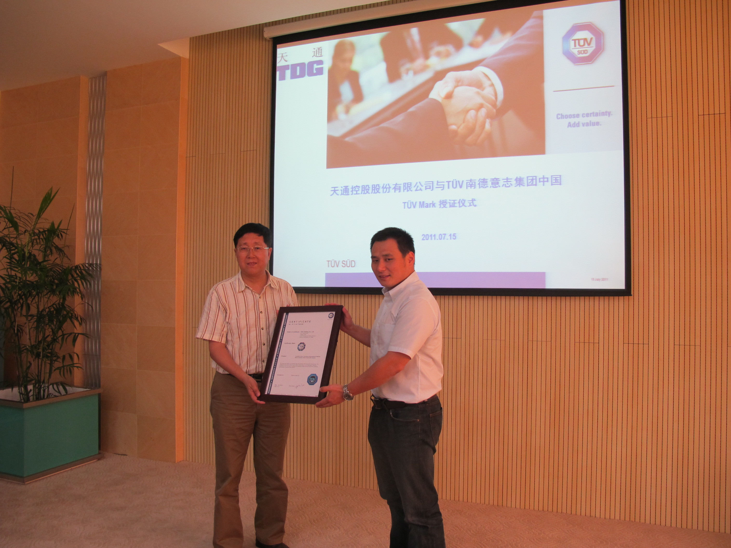 TUV南德意志集團(TUV SUD)為天通控股股份有限公司頒發TUV Mark證書