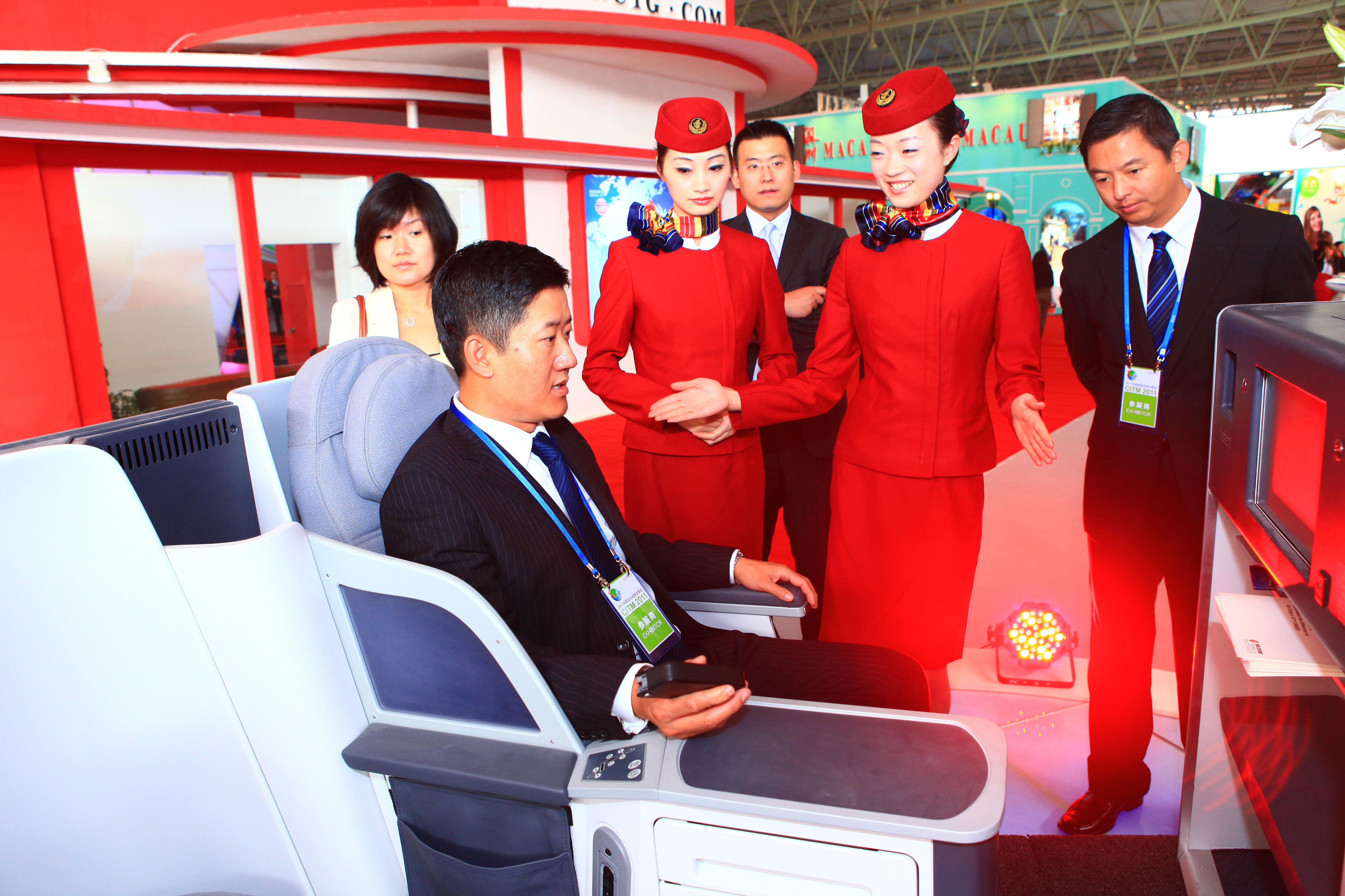 此次展會國航專門從北京運送了兩個波音777-300ER 飛機的平躺式公務艙座椅供參展人士體驗。躺在180度平躺的座椅上,寬敞豪華、舒適自在,座椅擁有一流的娛樂設施,個人操控的觸摸屏娛樂系統帶來超乎想象的現場感。新引進的波音777-300ER 雙發動機飛機具有更高的燃油效率,更低噪音,更長飛行距離的特點,將讓搭乘國航飛機的旅客享受到先進設施具有的獨特魅力,該型號飛機還被評為商務人士首選的機型。展臺擺放的這兩臺座椅旁一直都有空中小姐的操作演示和耐心解答,座椅的豪華舒適獲得了體驗人員的嘖嘖贊嘆,觀眾對國航的形象及產品留下美好而深刻的印象。