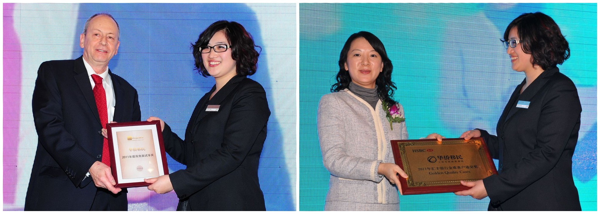 令華僑人感到自豪與驚喜的是,在此次華僑移民客戶答謝晚宴上匯豐銀行與加拿大嘉鼎基金帶給華僑公司“2011年匯豐銀行金質客戶遞交獎”以及“加拿大嘉鼎基金2011年較高免面試率”兩個特別大獎以肯定華僑移民在2011年度提交的眾多優質客戶及客戶材料。華僑移民加拿大文案總監朱麗娜女士代表華僑上臺領獎。