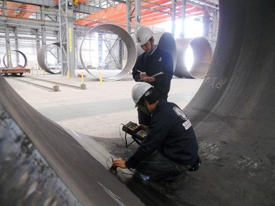 塔架作為風電場關鍵的承載部件,對于風機的安全運行起著重要的作用。相較陸上風電而言,海上風場其條件比較特殊,如鹽霧腐蝕等惡劣的環境、海上風機的維護不便等,使得確保風機結構及零部件的質量與可靠性顯得尤為重要。SGS 此次接受龍源的委托在該項目中提供風機塔筒的第三方監造服務,負責生產過程中的質量控制和進度控制,深知肩上責任的重要性。SGS 檢驗團隊由2011年8月開始,持續數月在江蘇如東塔架制造現場提供一系列的現場檢驗、檢測、審核、監督和質量控制見證等服務,參照歐洲海上風場風機設備質量控制的方案,重點關注塔架材料的理化性能、焊接質量、橢圓度及平面度尺寸控制、防腐處理等關鍵項目,從而確保58臺風電機組符合國際質量標準。
