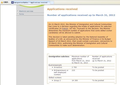 14300宗 -- 截止至2012年3月,魁省投資移民案件積壓數為14,300(4,884為新政,9,591為舊政),而2010年年底的舊政積壓量為12,131。華僑移民認為,加拿大移民局雖然期望通過2011年新政的翻倍漲價進一步提升移民人群質量,并相應攔掉部分涌入的移民潮,但目前的情況來看,移民人群依然有增無減。既然政府不希望用一刀切的方式簡單粗暴地提高拒簽率,所以希望通過提高門檻的方式抑制新的申請,從這一點上講,是加拿大政策對申請人負責任的一種表現。所以這一次的漲價也就在情理之中了。