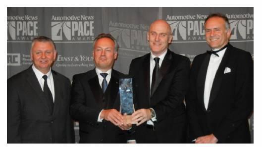 領受2012年《汽車新聞》汽車供應商杰出貢獻獎(PACE)的博格華納(BorgWarner)高層(從左至右):博格華納渦輪增壓系統(BorgWarner Turbo Systems)的高級工程總監斯特凡·穆茲博士(Stefan Muenz)、博格華納渦輪增壓系統(BorgWarner Turbo Systems)的全球乘用車產品總裁兼總經理弗雷德里克·利薩爾德(Frederic Lissalde)、博格華納(BorgWarner)的首席運營官詹姆斯·維利亞(James Verrier)、博格華納渦輪增壓系統(BorgWarner Turbo Systems)的工程副總裁阿諾·施瓦茨(Arno Schwar)。