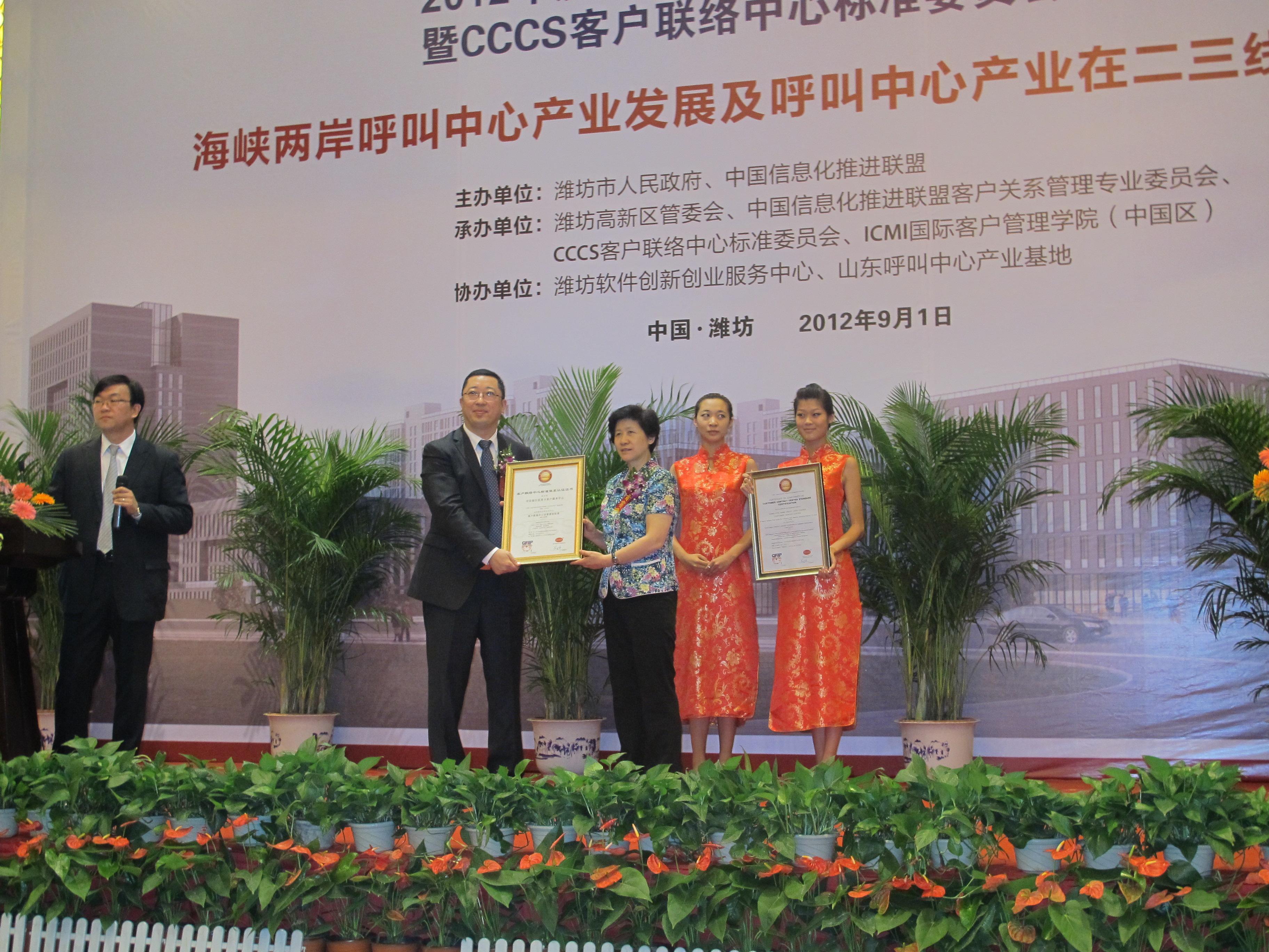 CCCS客戶聯絡中心標準委員會十年慶典之際,委員會頒發了2011-2012年度中國呼叫中心較佳實踐獎。國內五家優秀企業榮獲較佳實踐獎:招商銀行遠程銀行中心、中信銀行股份有限公司信用卡中心客服中心、中國國際航空公司電話銷售服務中心、上海盛大網絡發展有限公司客戶服務中心、山東萬聲通訊實業有限公司。