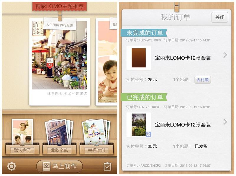 這一應用提供了拍照、圖像特效處理、在線個性化定制及線下制作派送一條龍服務的解決方案,用戶可以應用這一軟件完成拍照、編輯圖片,定制以照片為模板的各種個性化產品,如 LOMO 卡、照片書、手機殼等。