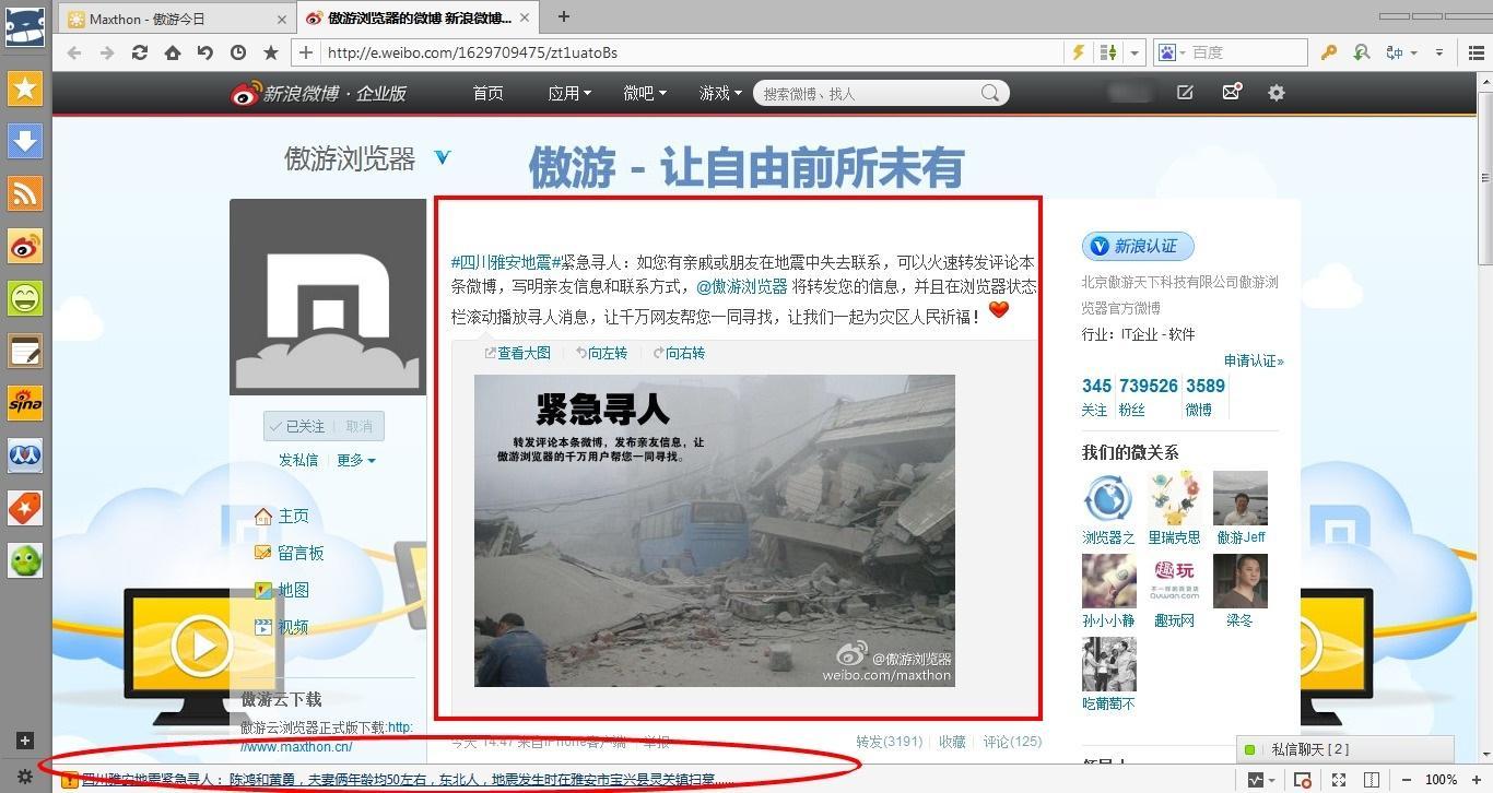 傲游云瀏覽器發起四川雅安地震緊急尋人活動