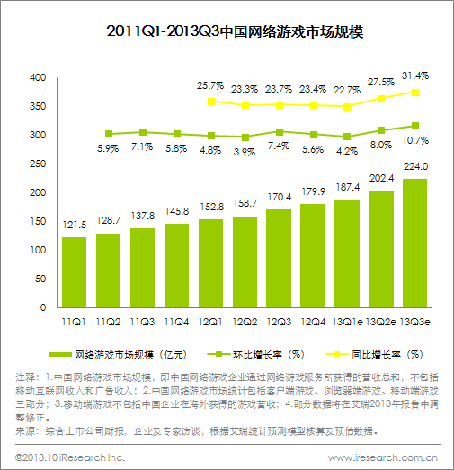 北京2013年11月19日電 /美通社/ -- 2013Q3網絡游戲市場規模達到224.0億元,同比增長41.4%、環比增長10.7%;移動游戲市場規模達35.7億元,同比增長75%。
