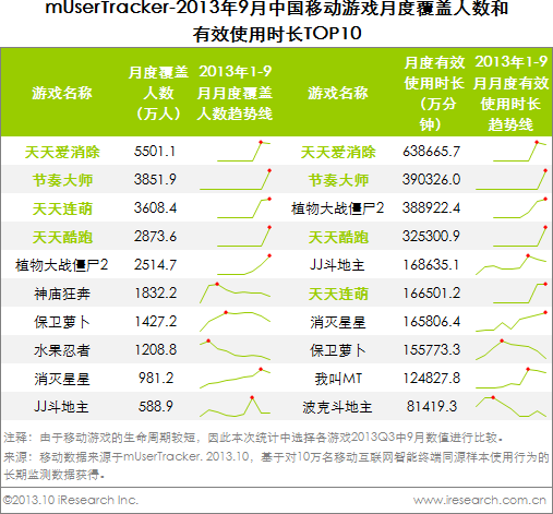 圖:2013年9月中國移動游戲月度覆蓋人數和有效市場TOP10